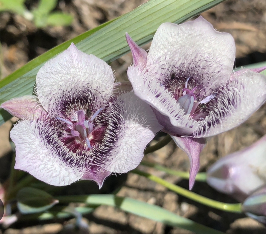 (Tolmie Mariposa Lily) This beautiful western native is a bulbous perennial found from Washington to California. Stems to 8-10” are topped mid spring to summer with multiple tri-petaled, bell shaped, lavender-white flowers covered in ‘fur’ with deep purple centers. Establish & abandon in a sunny location; prefers sandy/loam soils; plants are dormant by summer.