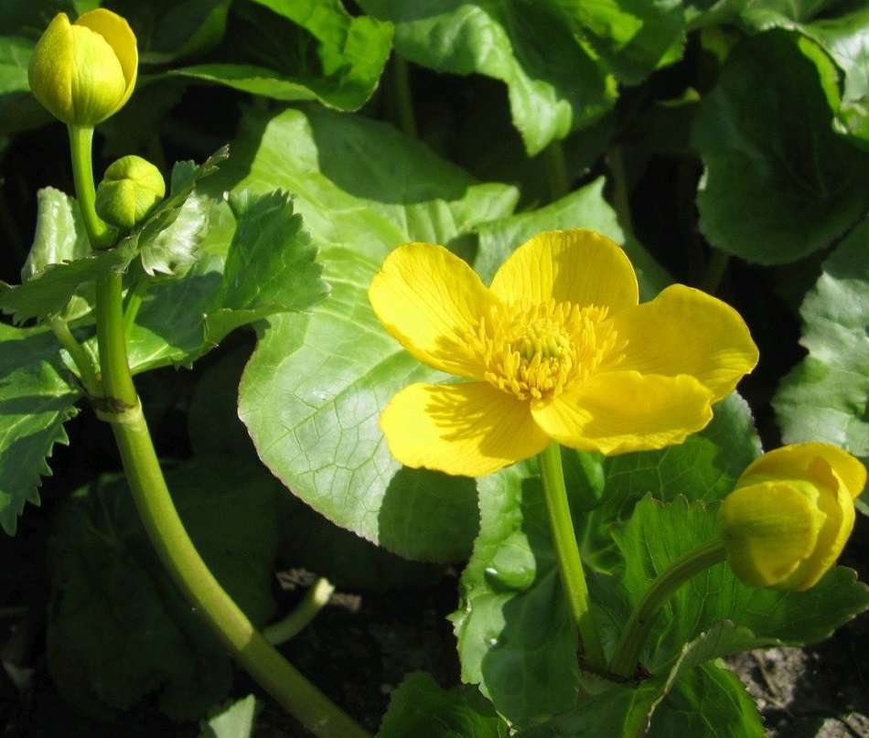 Marsh Marigold... the big version! Big leaves, big flowers! Glossy, rounded leaves come up in late winter, deep green with purple hues; the large golden yellow flowers come on in early spring. The plant stretches, yawns and reaches out to root with self layering stems. Makes a choice water plant and can be submerged... also wet areas, bogs – needs constant moisture and sun to light shade. We discovered this lovely and RARE plant at Heronswood (before the terrorist took it over).
