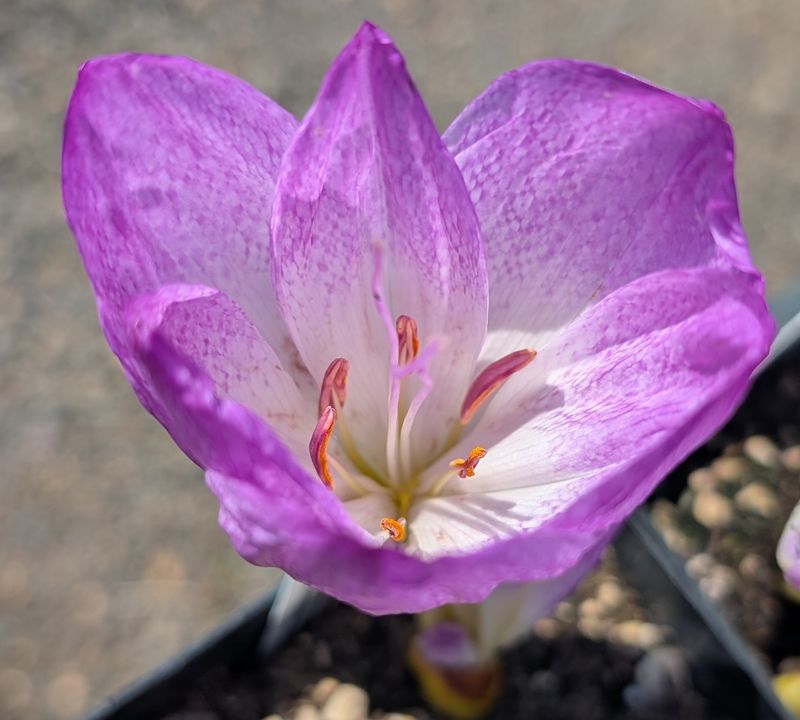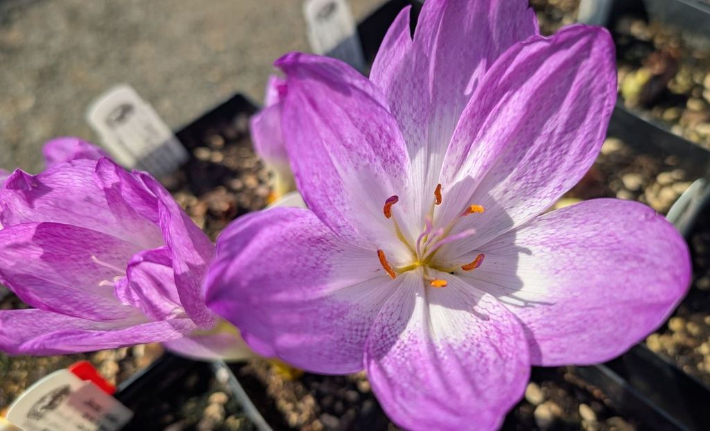 Cormous perennial that sends up strappy foliage in spring that is dormant by summer with naked blooms in fall – tulip shaped with bright rose-purple and intense tessellation (checker pattern) of petals and purple anthers, in low 6” tall, short clusters most of September, looking fresh for weeks. Thrives in sun in well-drained soil, appreciates moisture during growth and bloom periods, fine with dry during summer dormancy. Deer/critter resistant. All parts are toxic.