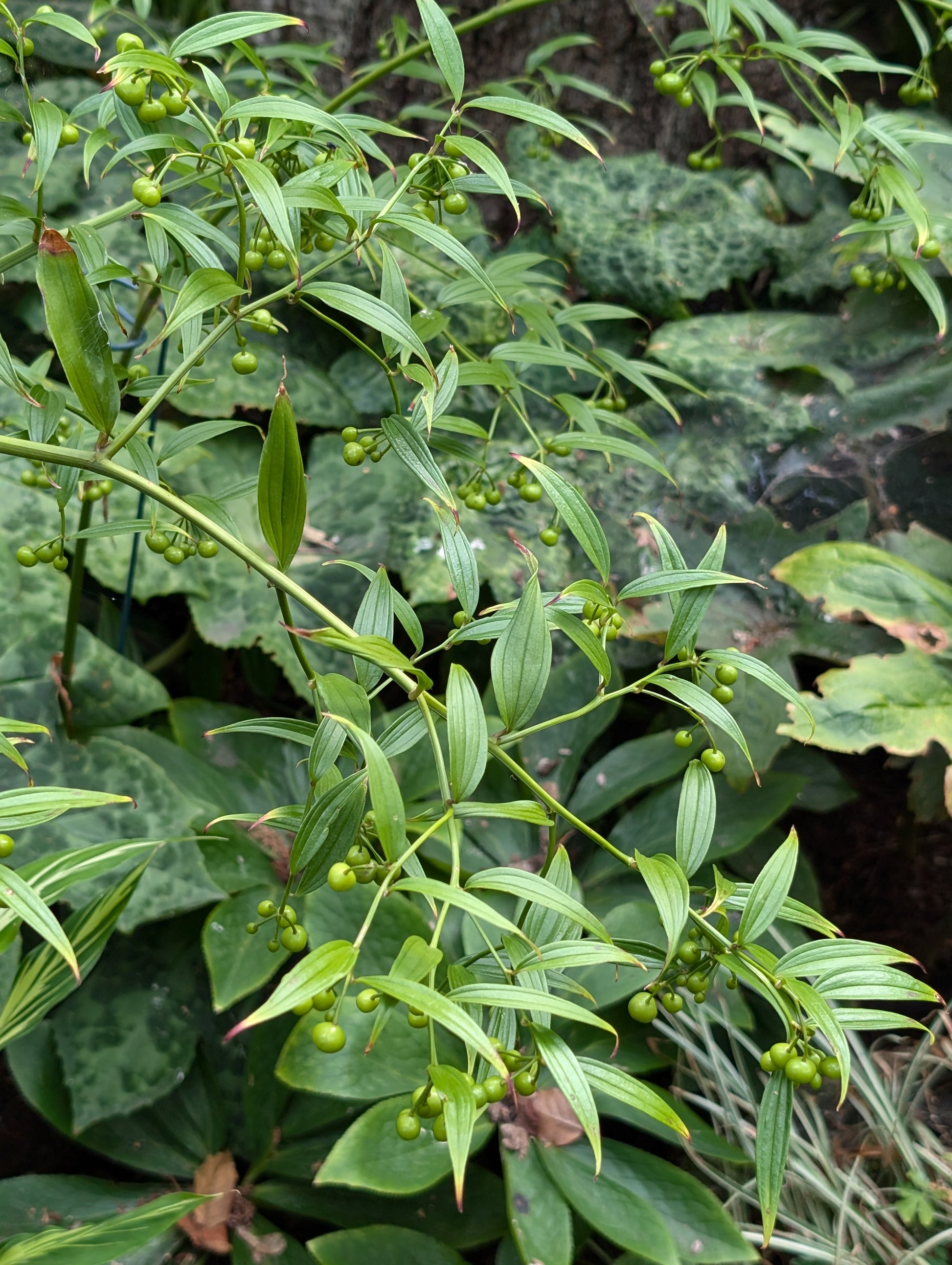 (Catonese Fairy Bells) Upright woodland perennial with sculptural stems reminiscent of bamboo 4-5’ tall, 2-3’ wide – deep purple leaves and buff papery bracts add to the effect! Graceful white bells dangle from tips April to June, followed by attractive purple-black berries – usually evergreen in winter – Easy to grow in rich, moist soils in light to moderate shade. Explore the dark side of this exquisite beauty! A Heronswood introduction.