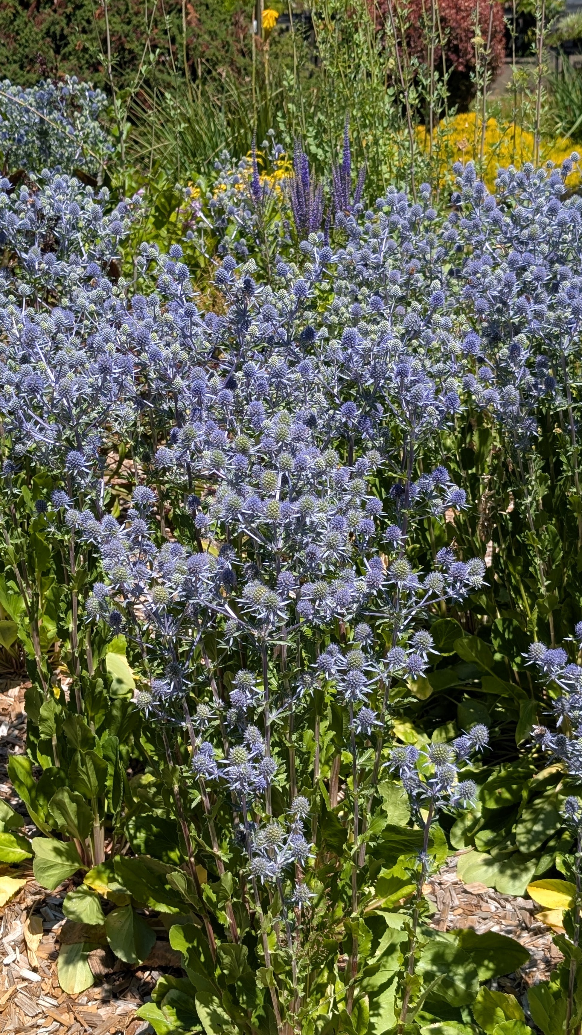 (aka 'Blaukappe') Drought? Baking hot spot? Deer? No problem! ‘Blue Glitter’ throws out more flowers sooner than older varieties on well branched plants. Tough and well-armed, the careful gardener adores these eye-catching steel blue thistle flowers for arrangements (fresh or dried). Plants stand tall at 2-3’ in clumps half as wide; they bask in full sun and are best in sandy, well drained, dry soils (they also tolerate semi-regular watering). Bloom time starts in June and goes through September.