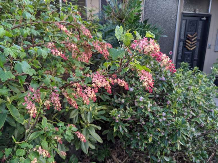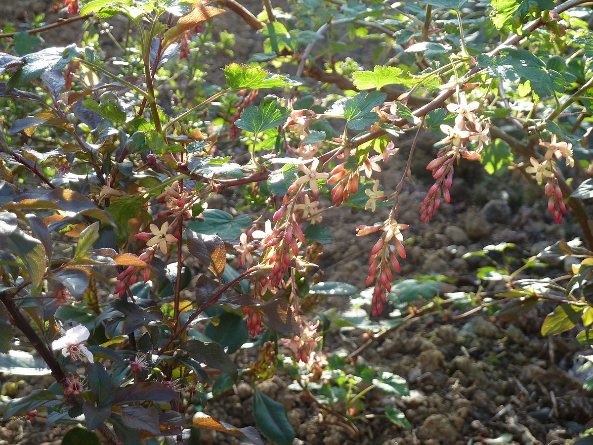 Interesting Currant cross between Ribes odoratumand R. sanguineum, this deciduous shrub has more horizontal branching than mostRibes forming a rounded shrub 4-5. Springflowers are softly fragrant and striking coppery rose with yellow interiors poppingfrom berry color buds hanging in graceful pendant racemes. Average garden conditions, moderate water,not fussy. Sun to part shade (flowersbest in sun). Exceptional at thewoodland edge.
