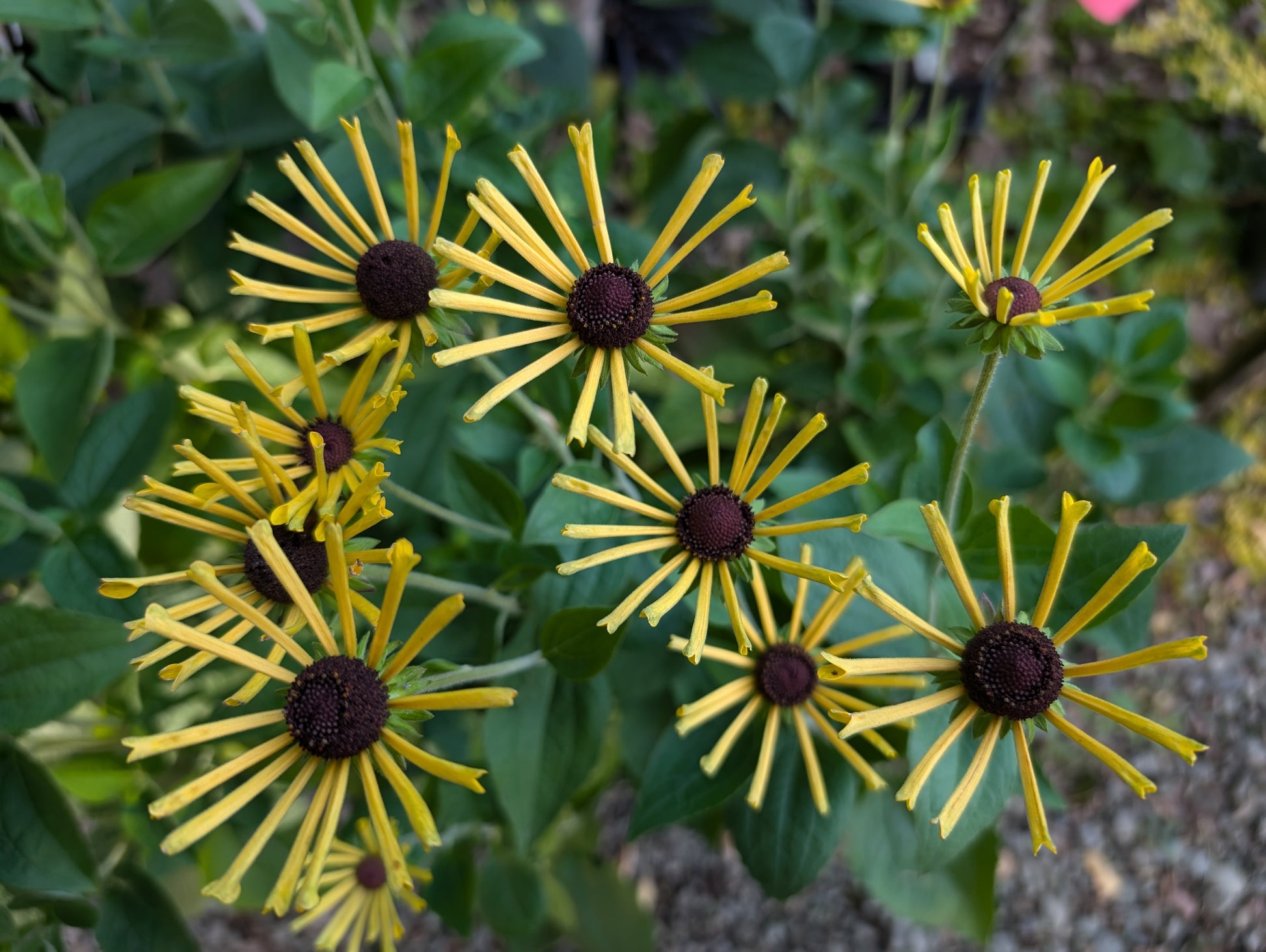 Compact perennials 2’ wide with very upright stems 3-4’ tall topped by clusters of butter yellow coneflowers with narrow, quilled ray florets and burgundy-brown centers late summer to frost. Full sun, average soils, moderate water; drought tolerant and heat/humidity resistant. Nice cut flower.