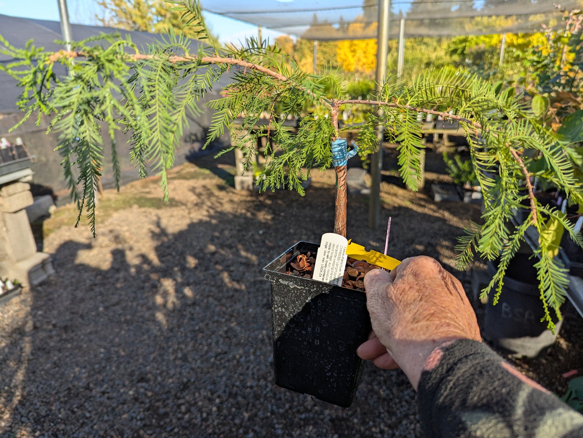 Weeping Bald Cypress; upright pyramidical tree eventually 40-50’ tall and half as wide with almost horizontal branches with weeping, deciduous, feathery, light green foliage. Enjoys sun in moisture retentive soil (even clay) that is consistently moist to wet; lovely specimen in containers; rain gardens and boggy areas. Deer resistant.